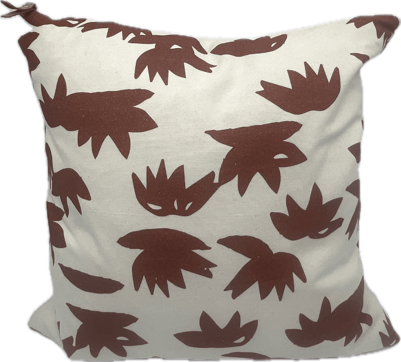 Square pillow with rust colored abstract design with leather tipped zipper.
