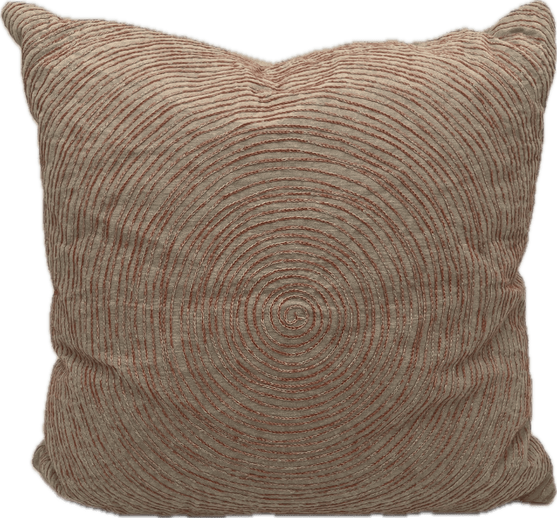 Square pillow with orange embroidered spiral design.