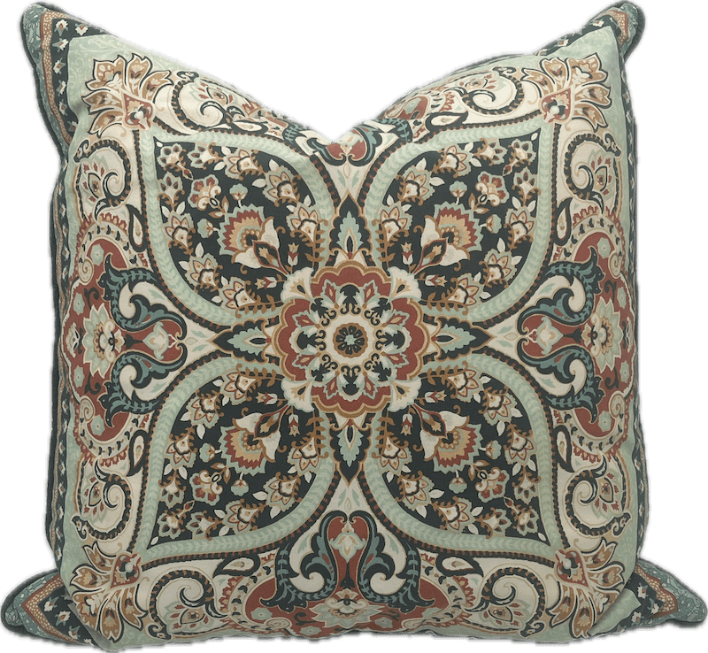 Square throw pillow with an ornate floral medallion pattern in warm shades of terracotta, sage, navy, and cream.