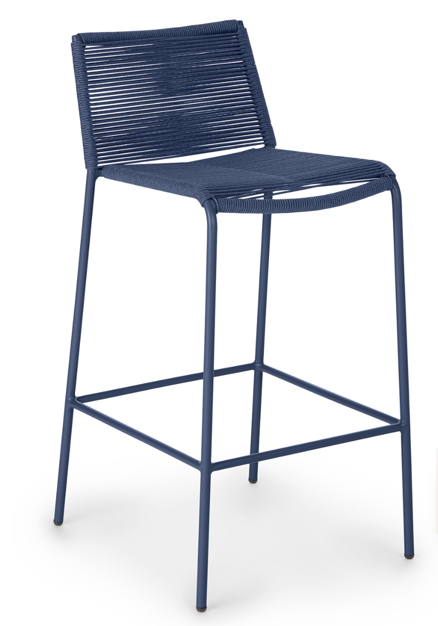 Article outdoor bar stool in blue string weave with metal base.