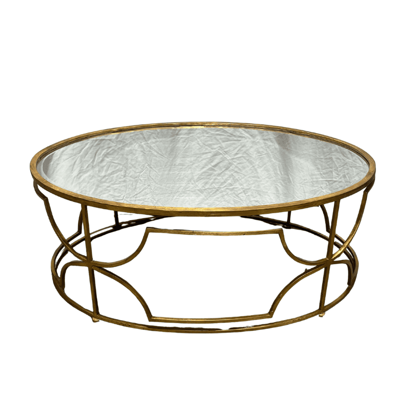 Round cocktail table with clear glass top and gold-finished metal frame. Open circular base with curved metal supports.