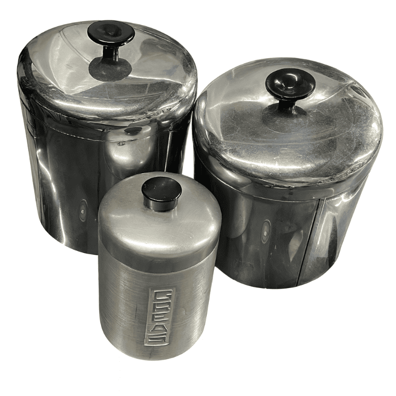 Silver spun aluminum nesting canisters varying in size from the 1950s.