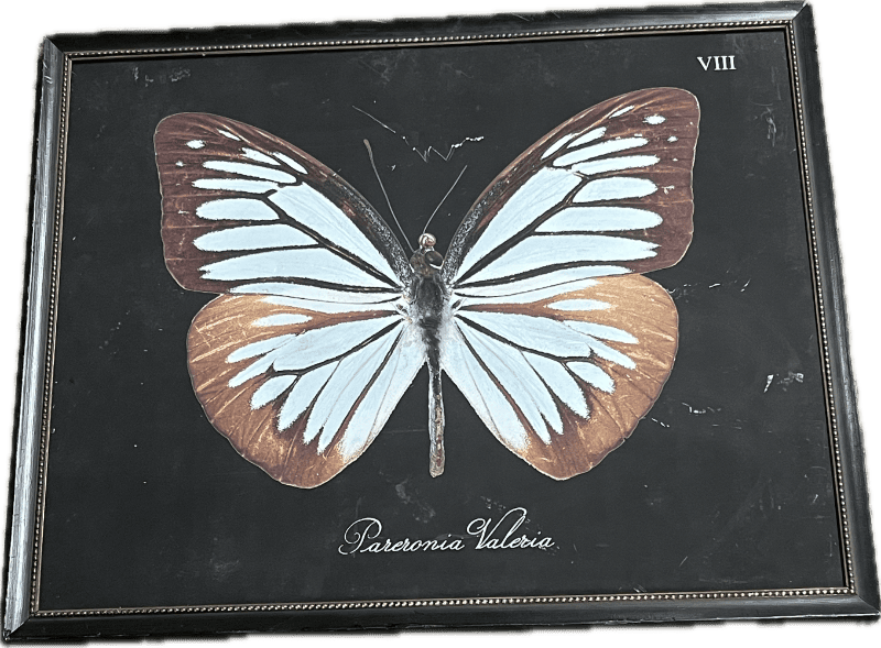 Painting of butterfly in taxonomical style with with “Pareronia Valeria” text in cursive.