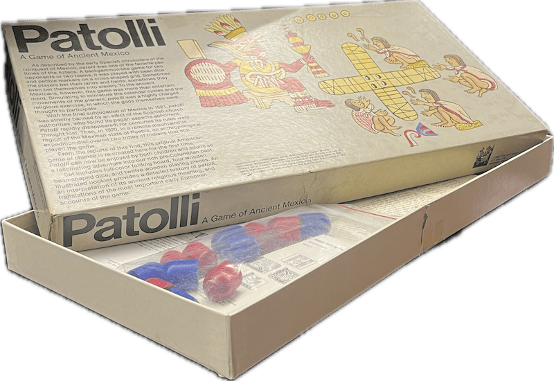 Vintage edition of Patolli: A Game of Ancient Mexico, a reproduction of one of the oldest known games in the Americas. The box features stylized Aztec artwork and text detailing the historical origins of the game. Includes game pieces in red and blue.