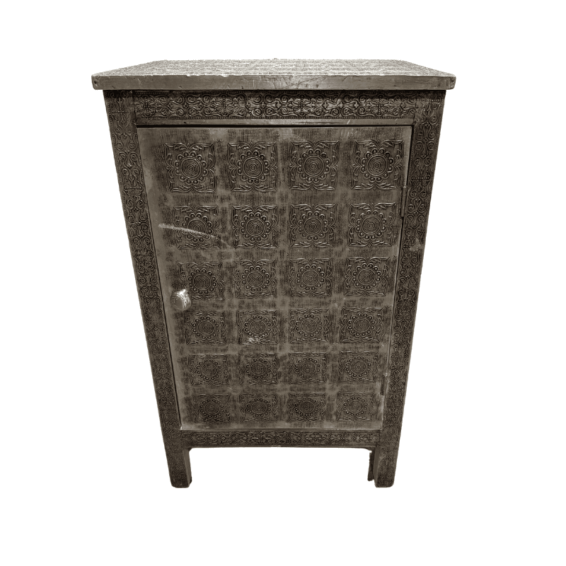 Compact storage cabinet with an embossed aluminum exterior featuring a repeating floral pattern. Single front door with round knob. Rectangular form with flat top and short legs.