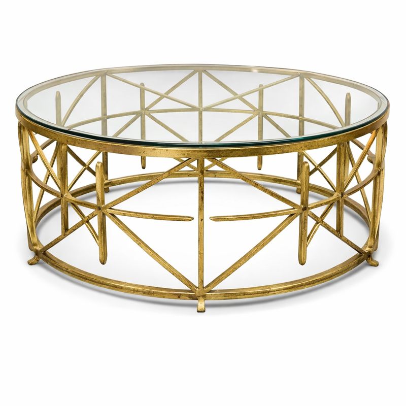 Round cocktail table with clear glass top and gold gilded metal base. Open geometric lattice design with circular support rings.