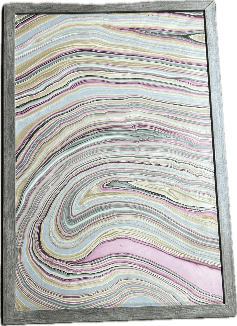 Pink and green marbled art in gray rectangular frame.