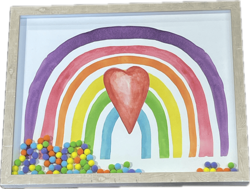 Print of rainbow with heart in natural wood frame, assorted colored pom-poms inside of the glass.