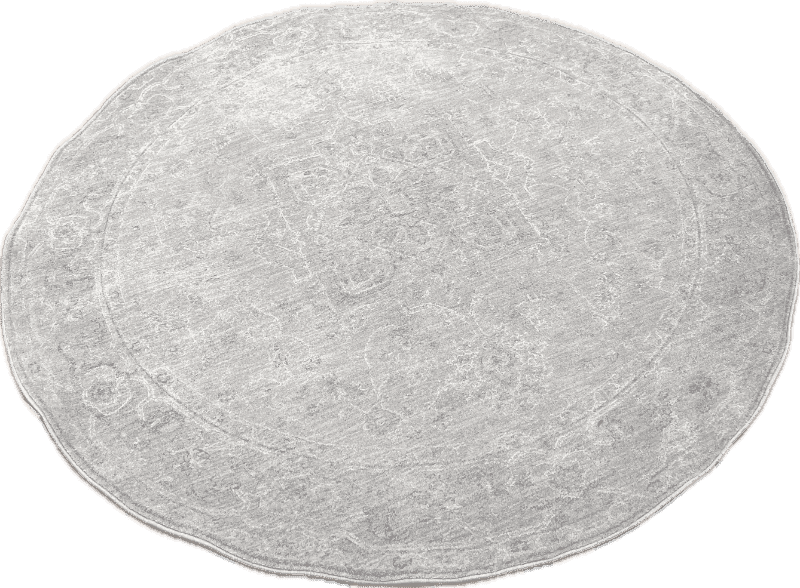 Soft, round area rug in a muted grey tone with a subtly distressed traditional pattern. Made by Ralph Lauren.