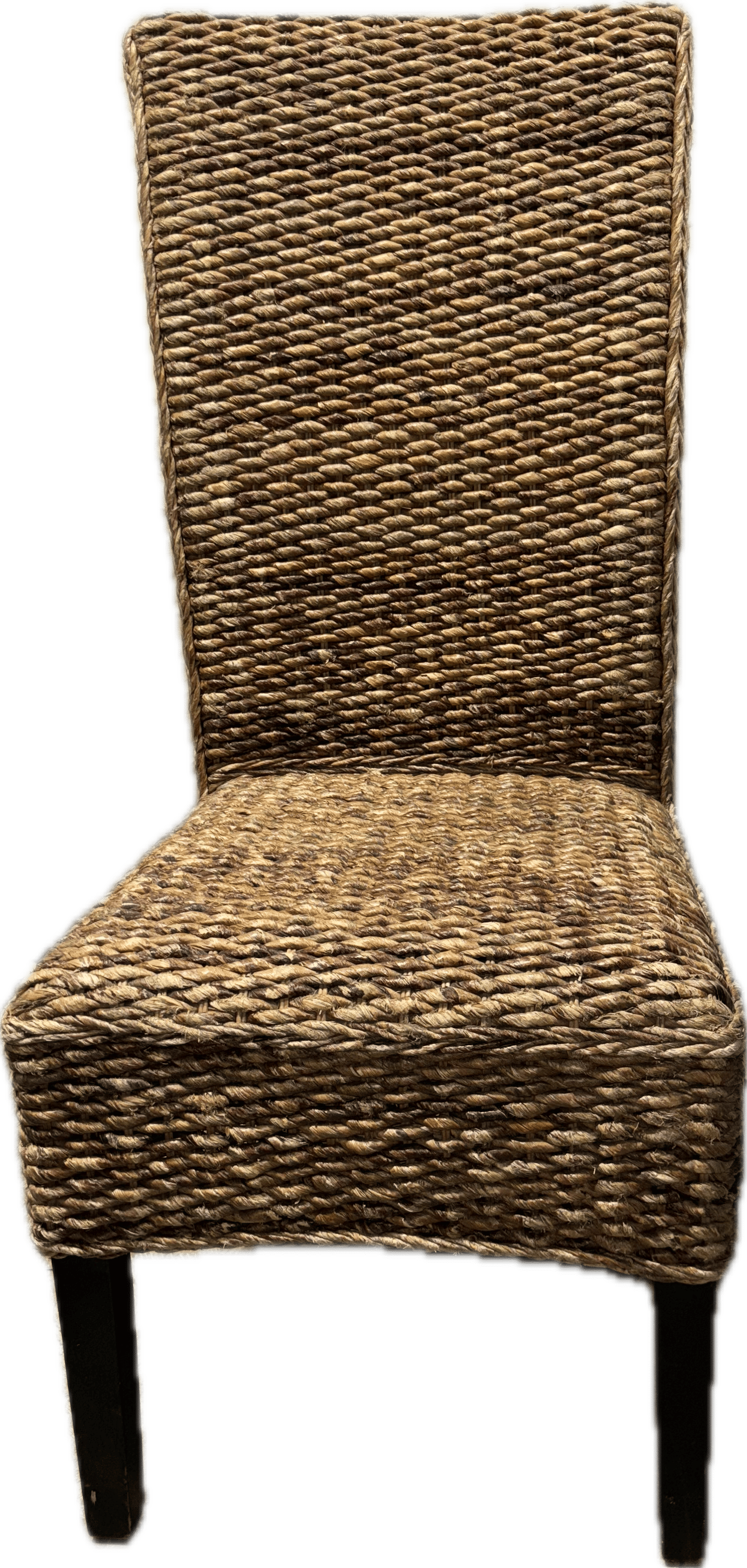 High-back rattan dining chair wrapped in woven natural fiber with a tight, uniform texture and woven detail down the edges.