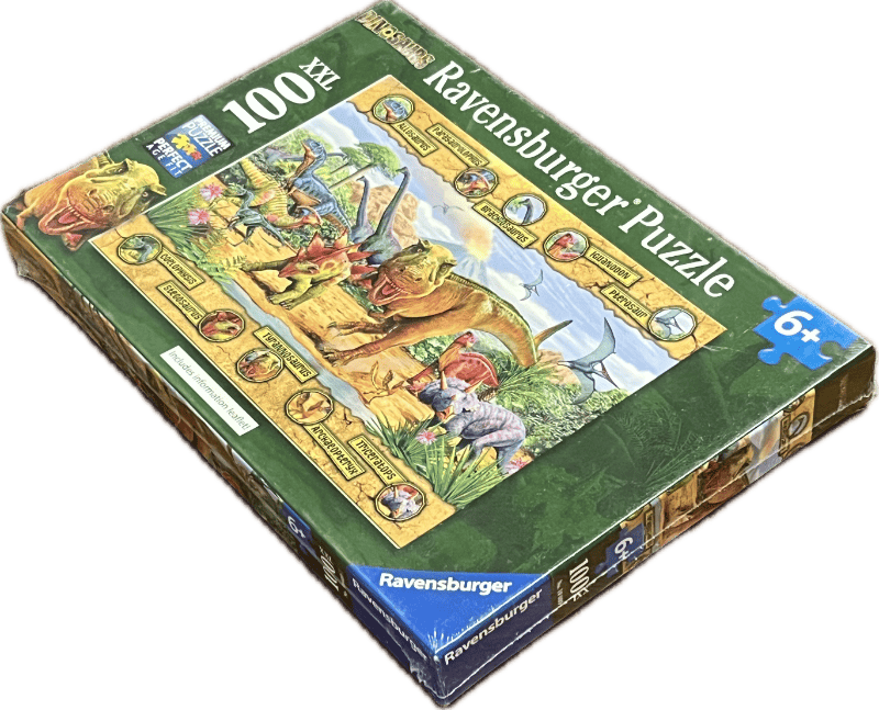 Ravensburger 100-piece “Dinosaur Discovery” jigsaw puzzle. Features colorful prehistoric imagery with multiple dinosaurs in a lush landscape. A classic children’s puzzle known for Ravensburger’s signature quality and collectible box art.