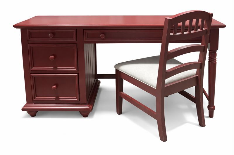 Painted red writing desk with three stacked drawers and one shallow center drawer. Includes matching wood side chair with upholstered seat and ladder-back design.