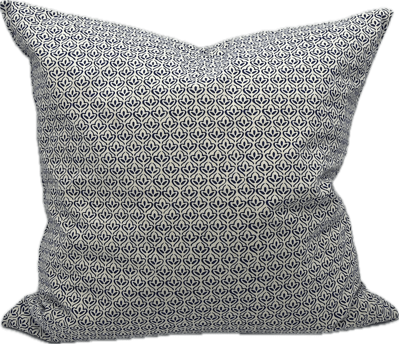 Blue pillow with light, muted white geometric repeating feather design.