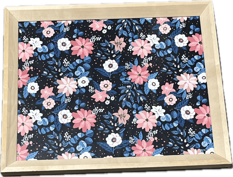 Blue and pink floral print with light wood frame.