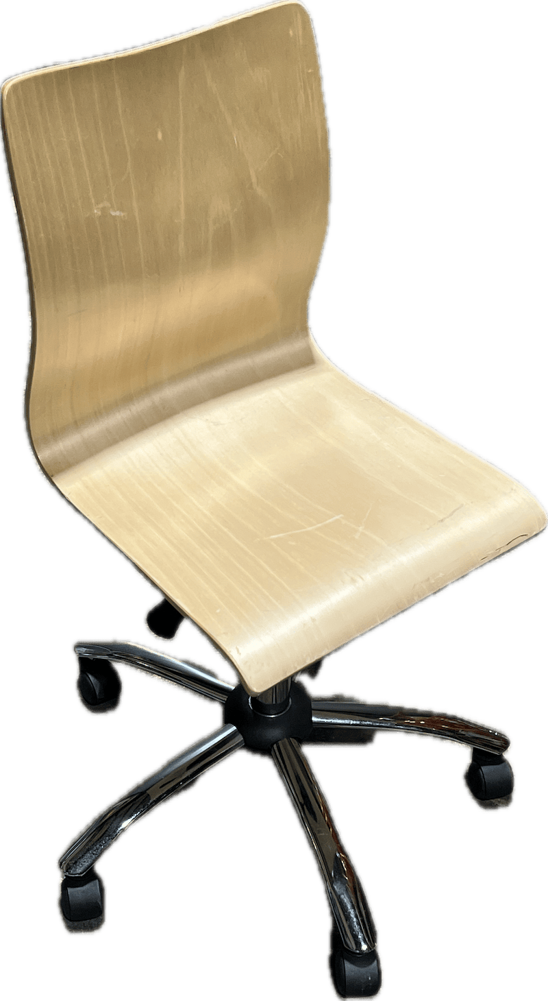 Contemporary armless office chair featuring a molded bentwood seat and back in a light natural finish, with 5 rolling wheels.