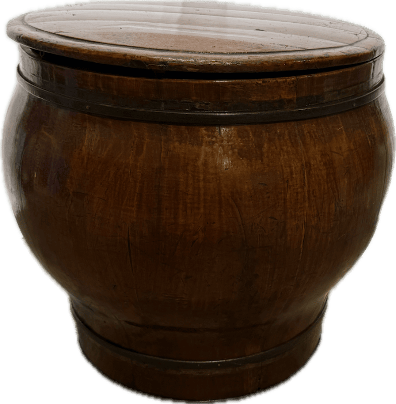 Handcrafted round wooden barrel table with smooth curved sides and a flat top. The deep amber finish and rich wood grain evoke the warmth of aged vessels.