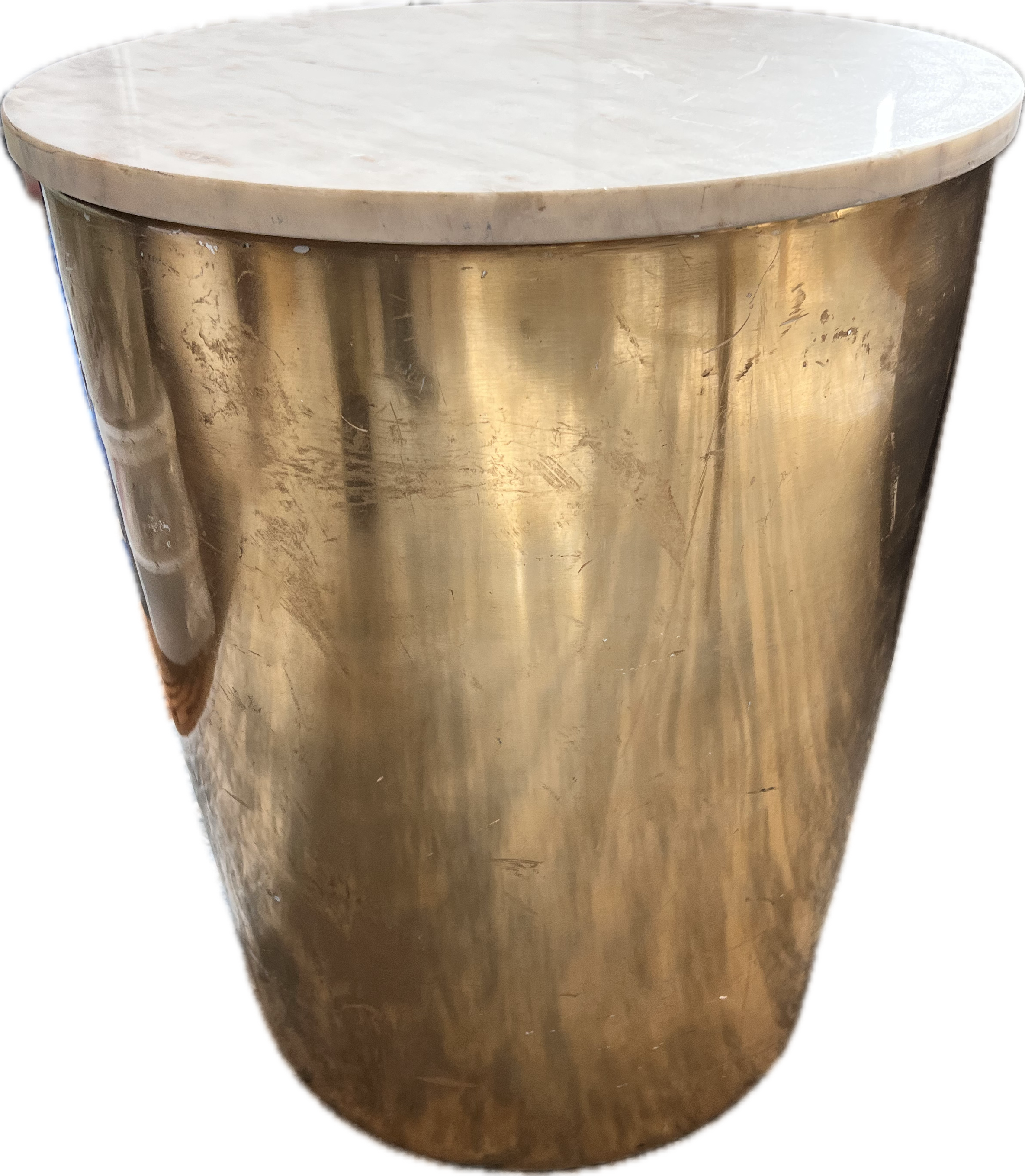 Round gold side table with removable marble top.