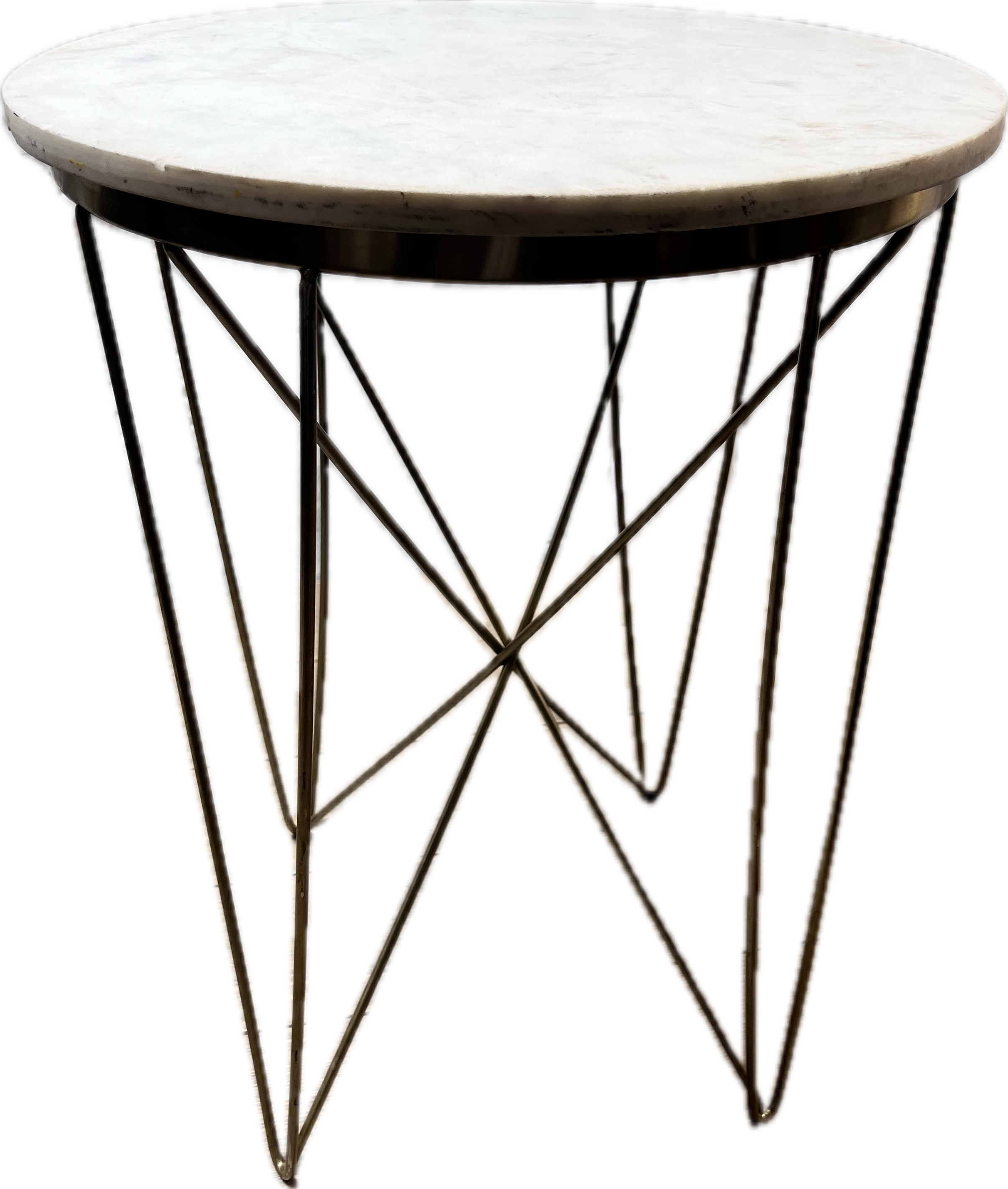 Round marble top side table with gold metal hairpin legs.