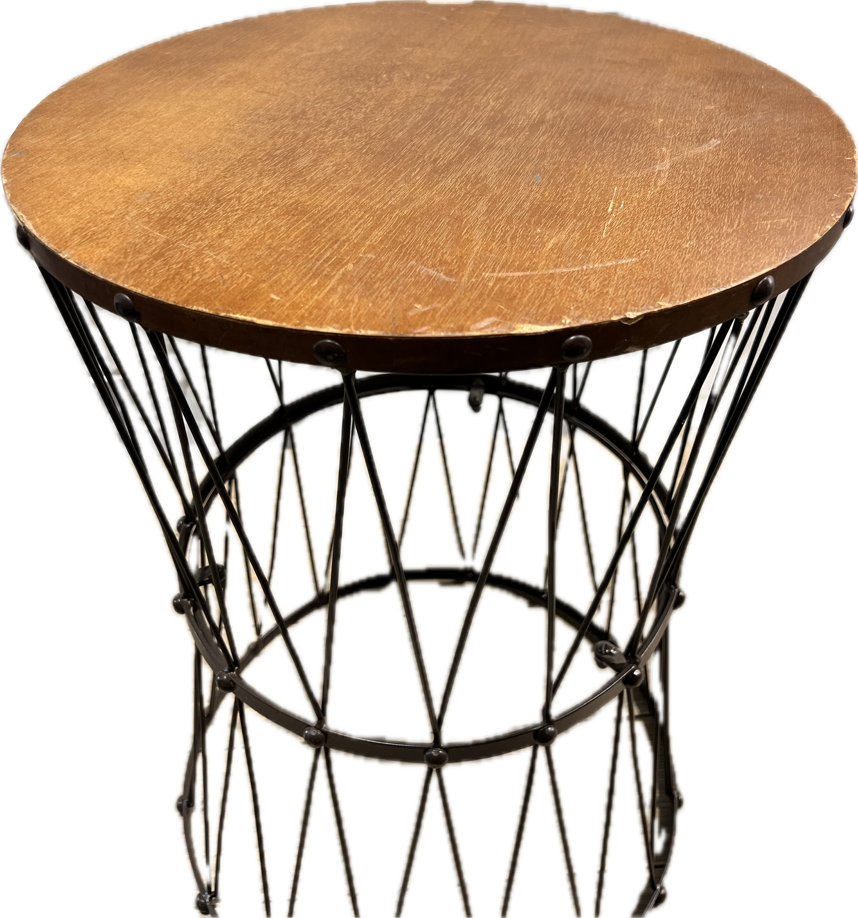 Side table with black basket design base with a medium brown top.