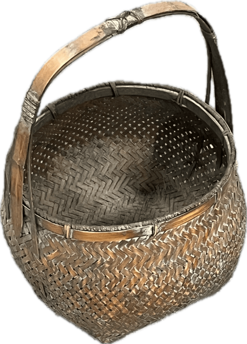 Dark brown woven bamboo basket with handle.