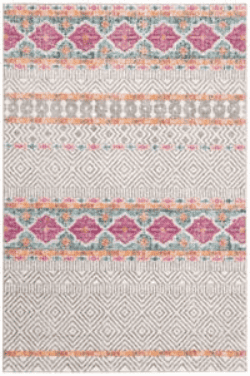 Vibrant flatweave rug featuring a mix of geometric stripes and medallion motifs in coral, turquoise, gold, and soft gray tones.