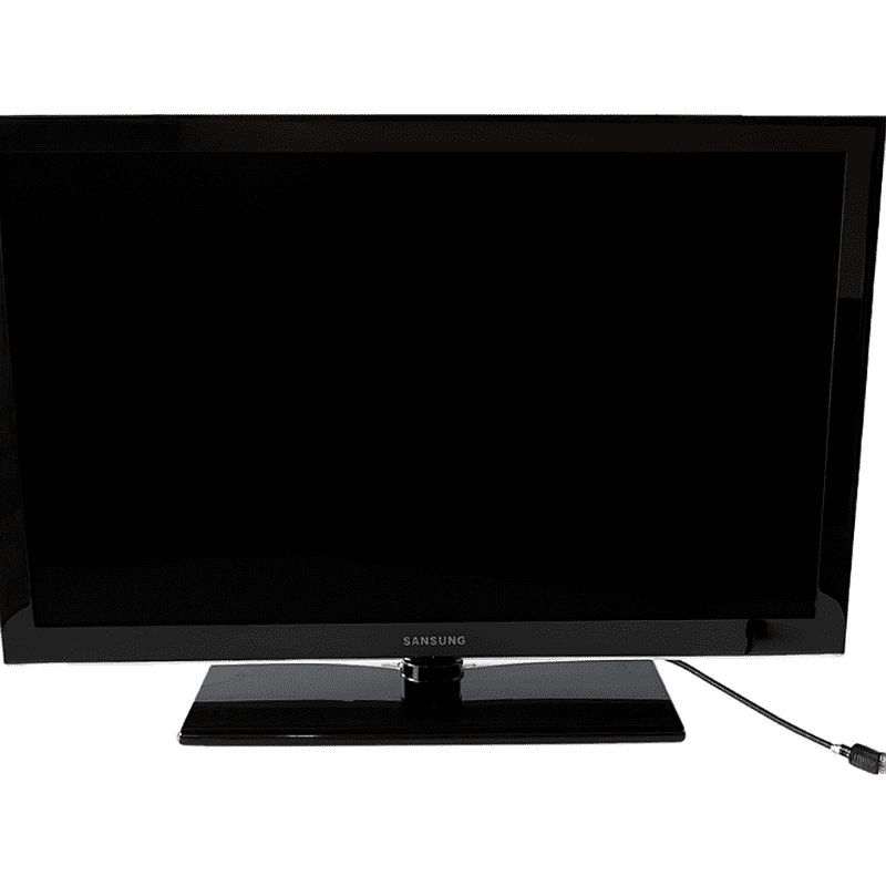 Samsung flat-screen television with a glossy black frame, rectangular base, and attached power cord.