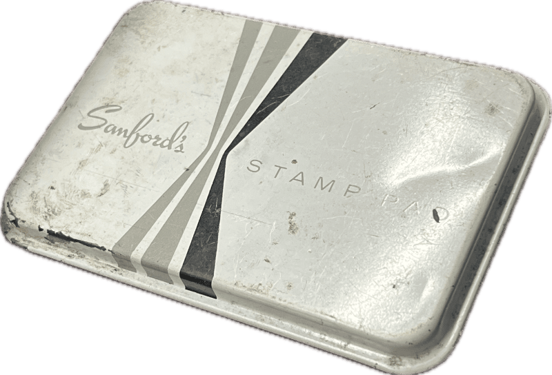 Vintage tin stamp pad case with black ink pad.
