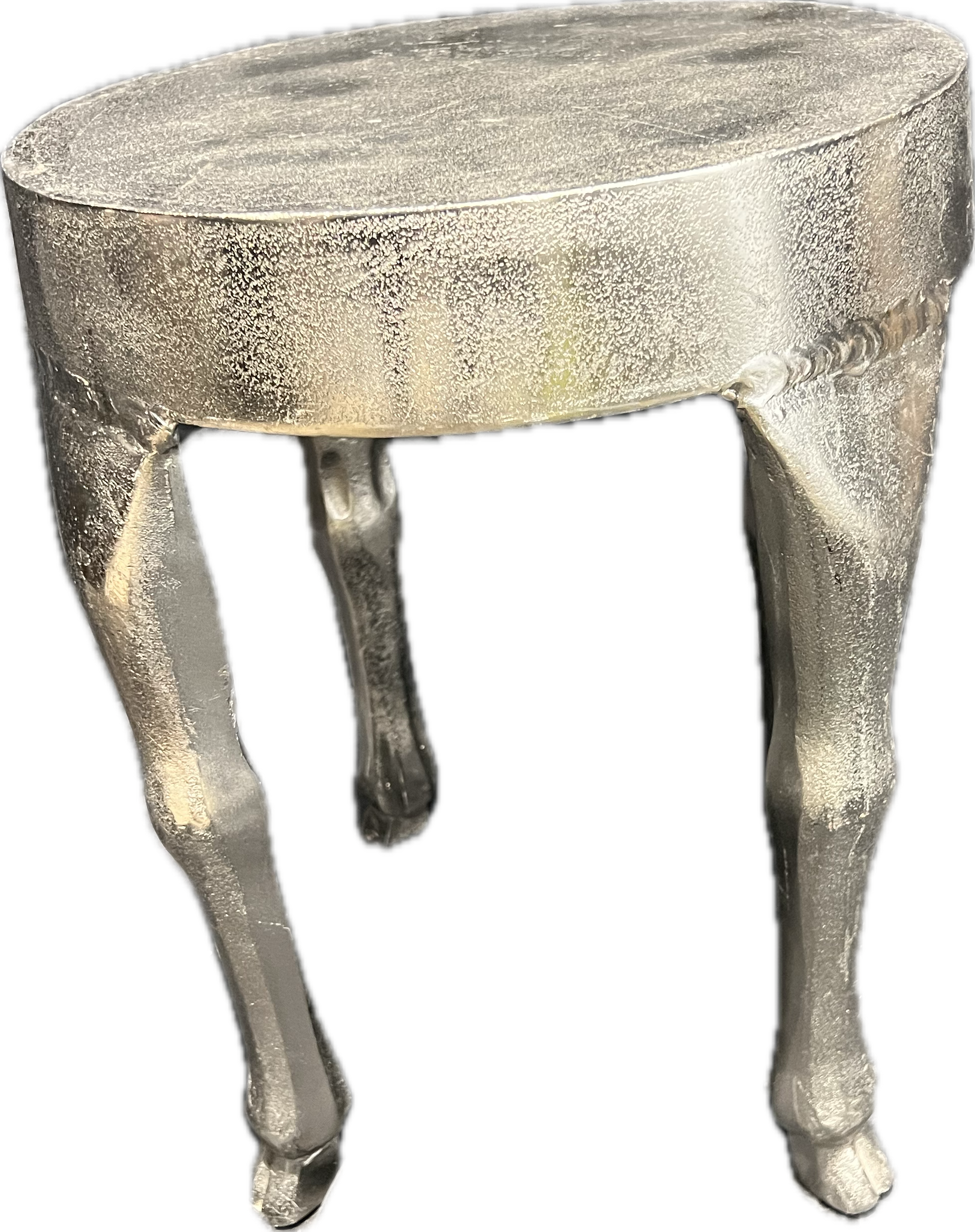 Round silver metal table with hoof shaped feet.