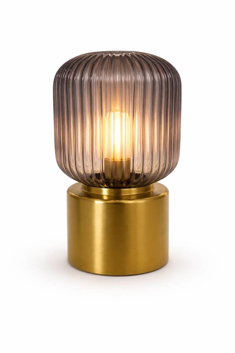 Compact lamp with a vertically ribbed, smoke-tinted glass shade set atop a cylindrical brass-tone metal base.