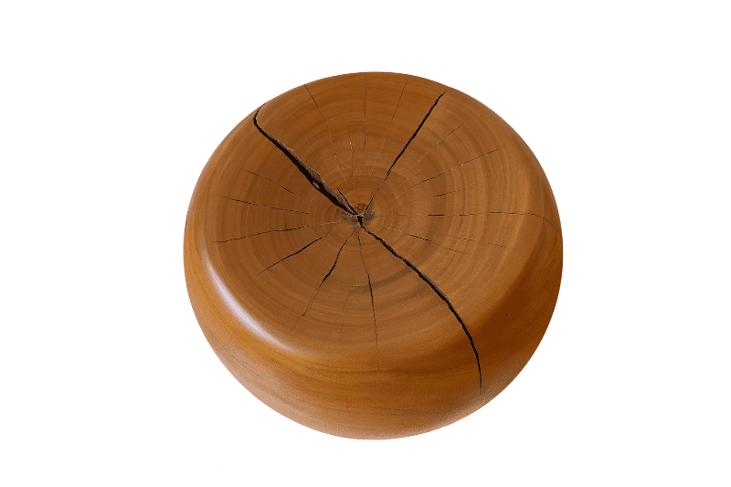 Smooth, rounded solid wood drum side table with natural grain and warm tone. Minimalist silhouette and subtle surface cracking.