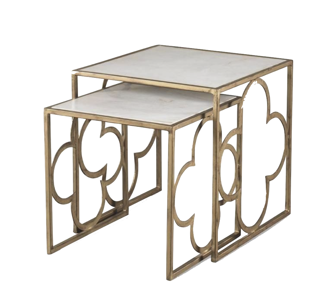 Nesting marble top side tables. Base is gold metal with quatrefoil design.