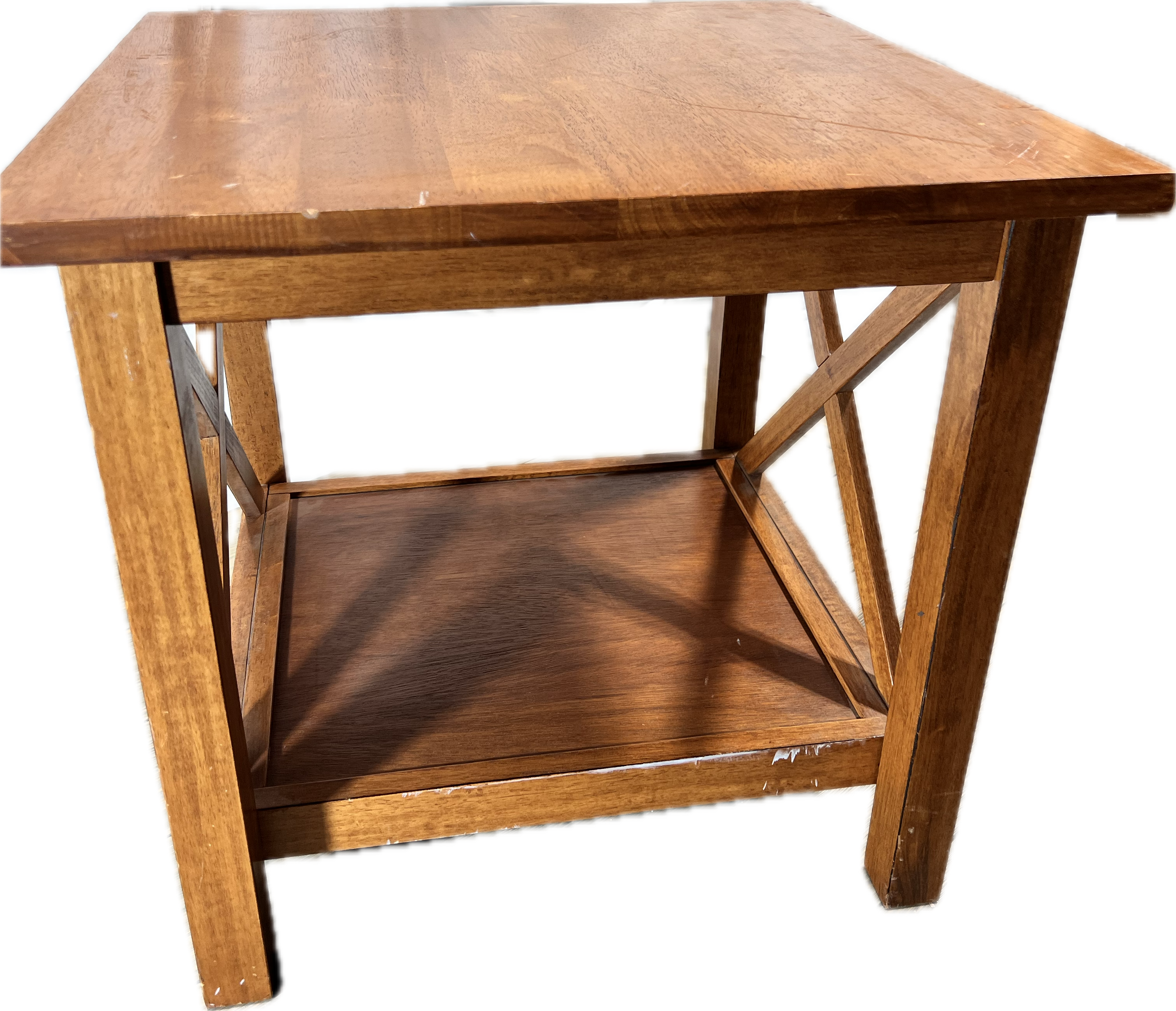 Square honey side table with shelf and X accent.
