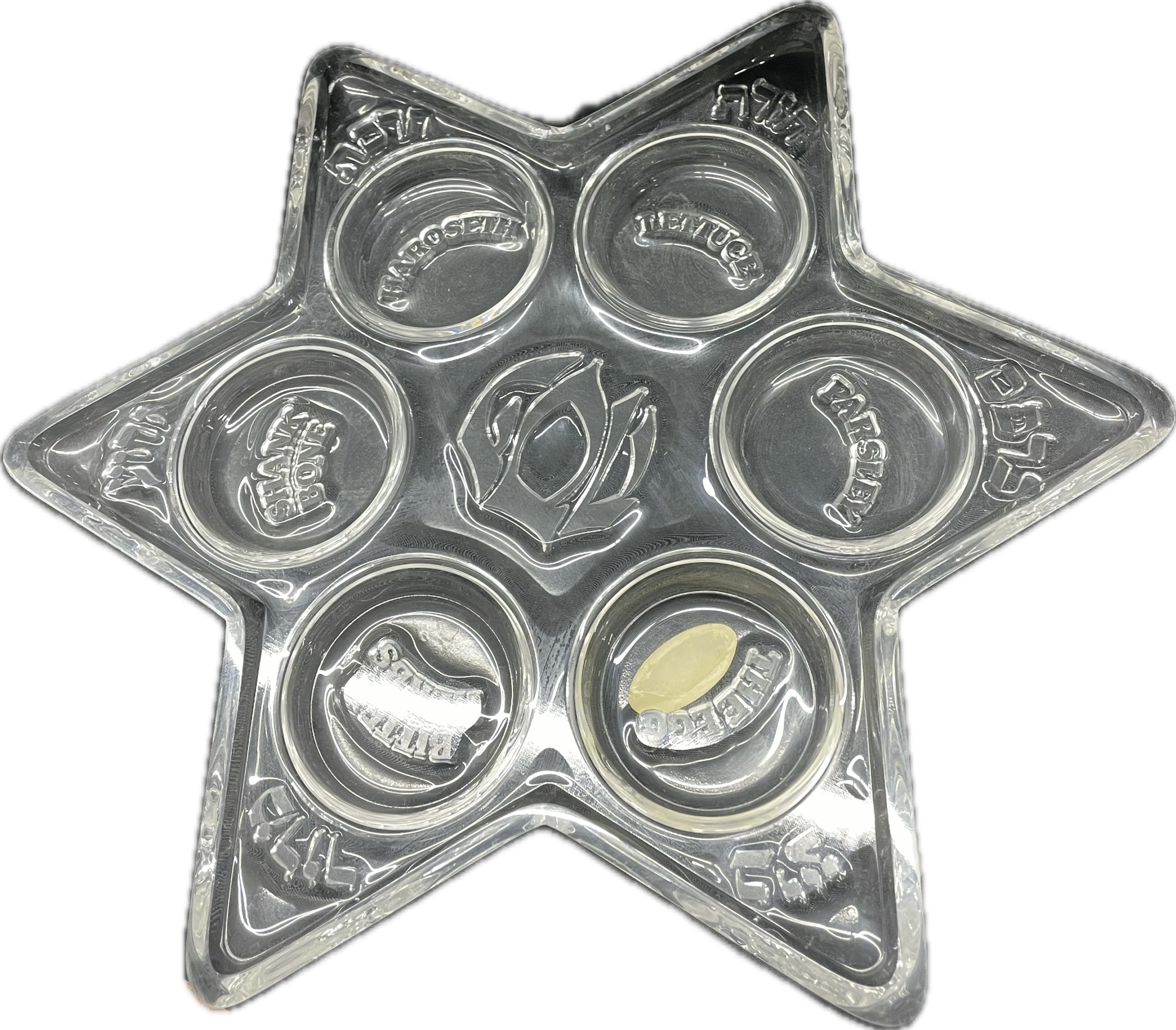 Silver and plastic Star of David seder plate.