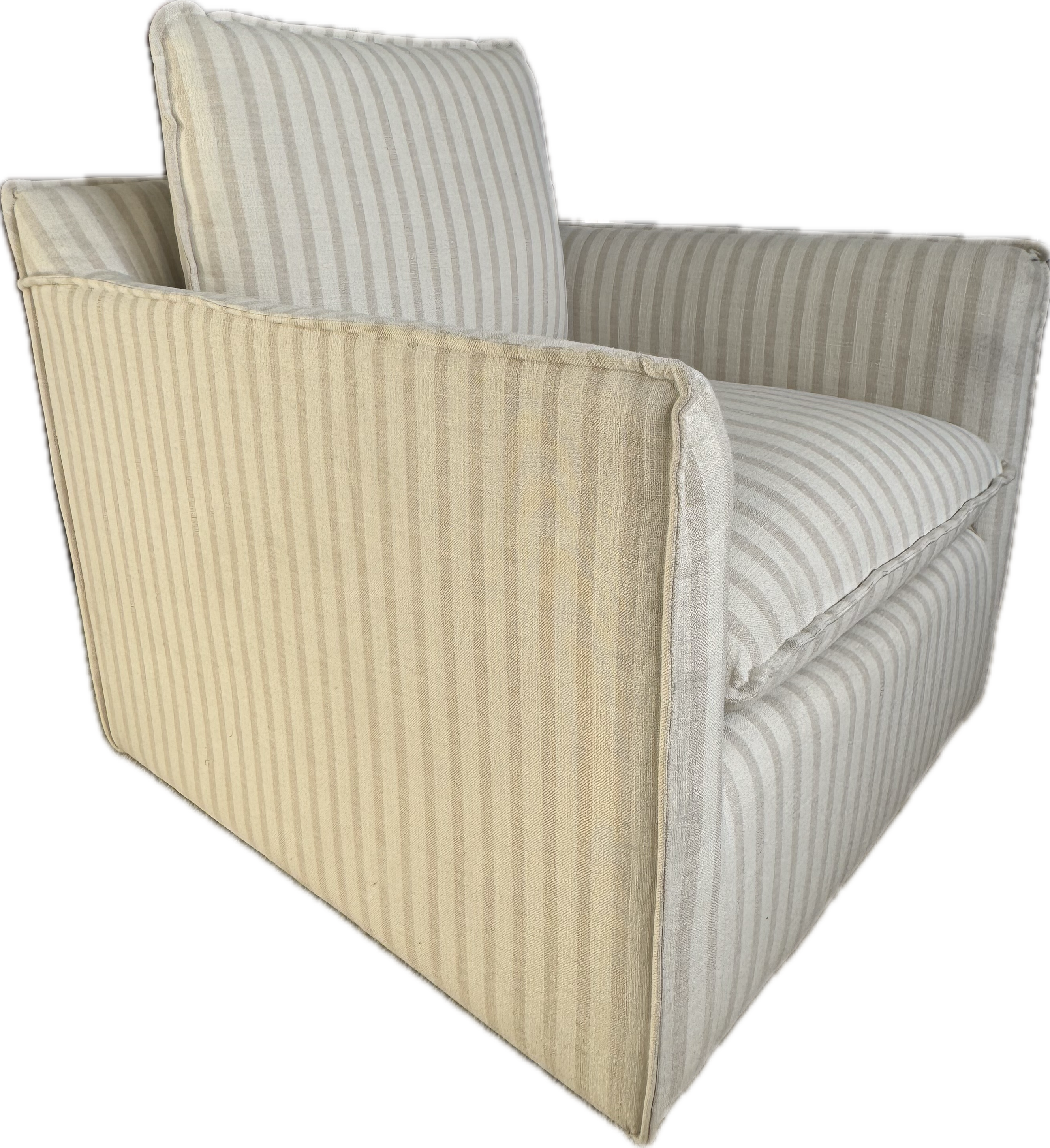 Swivel upholstered beige and white striped chair.