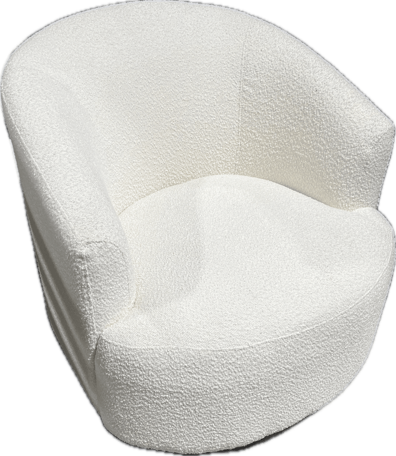 Compact barrel-back accent chair with a continuous curved back and integrated arms. Fully upholstered in textured white bouclé fabric.