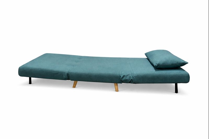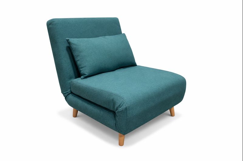 Convertible chair that opens to a flat sleeper position. Includes one loose rectangular back cushion. Short exposed wood legs. 75″ width, 29″ height, 11″ length when open as a bed.