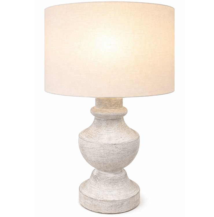 Sculptural baluster-style table lamp with a textured, stoneware-like finish in a soft off-white tone.
