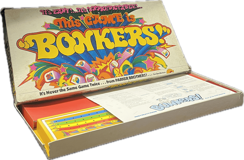 Vintage “This Game Is Bonkers!” by Parker Brothers — a riot of 1970s color and playful typography. Includes game board, cards, and original instruction sheet.