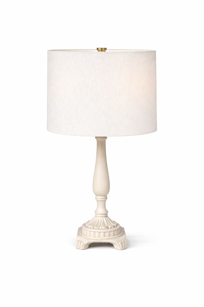 Traditional style table lamp featuring a turned ivory base with carved detailing and a softly weathered finish. Topped with a clean white drum shade.