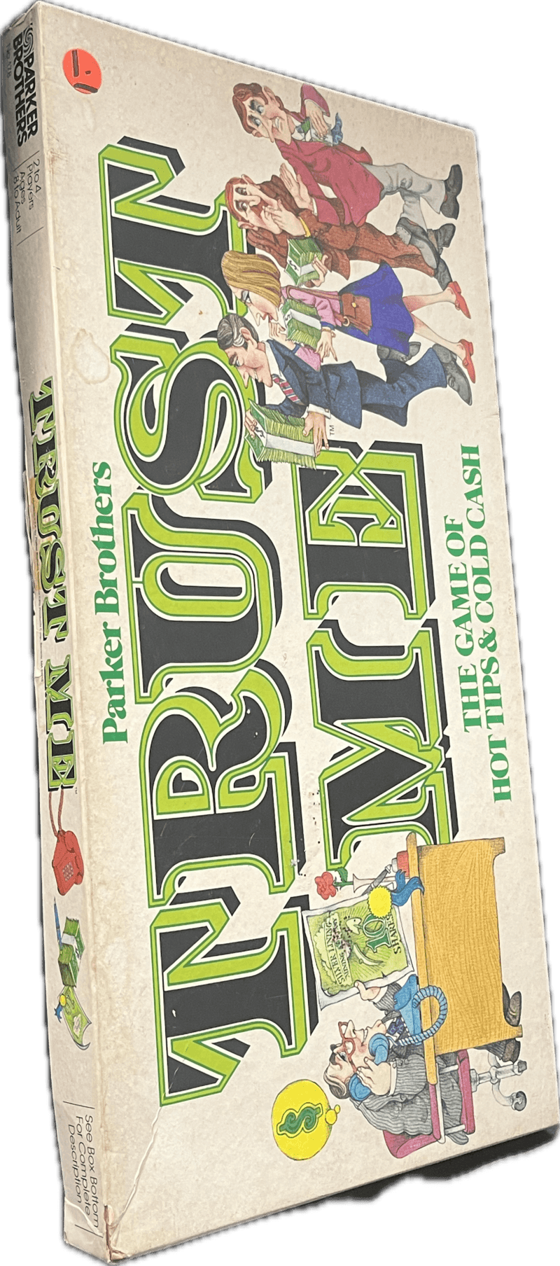 Vintage “Trust Me” by Parker Brothers — a satirical business-and-banking game from the 1960s featuring playful illustrations of corporate characters and witty typography.