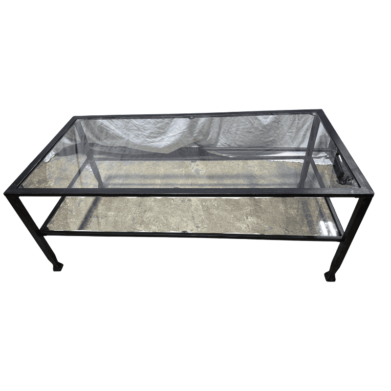 Rectangular coffee table with a slim black metal frame and a clear glass top. Open, minimalist construction with straight legs and a low profile.