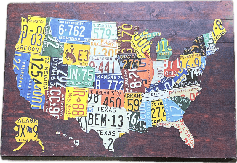United States map with license plates as states.
