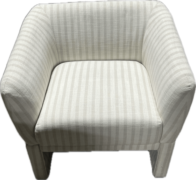 Squared back accent chair with integrated arms, fully upholstered in vertically striped fabric.