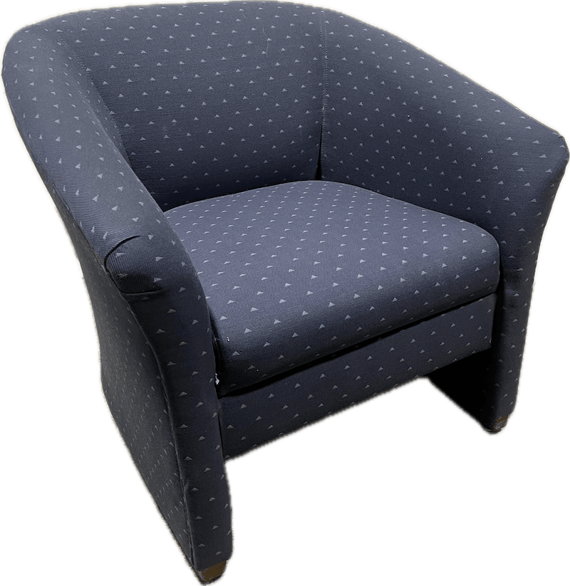 Compact club chair upholstered in blue fabric with small repeating dot pattern.