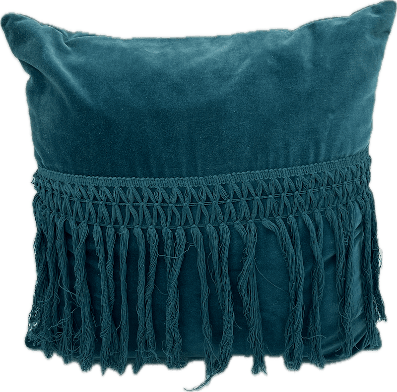 A rich teal velvet pillow accented with a bold macramé fringe detail for a touch of bohemian luxury.