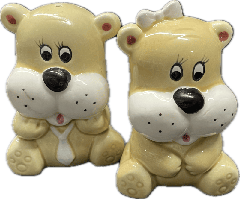 Vintage cartoon style ceramic bear salt and pepper shaker set, with one bear wearing a tie and the other a bow. Novelty kitchenware produced in Japan for the export market,1950s to 1960s.