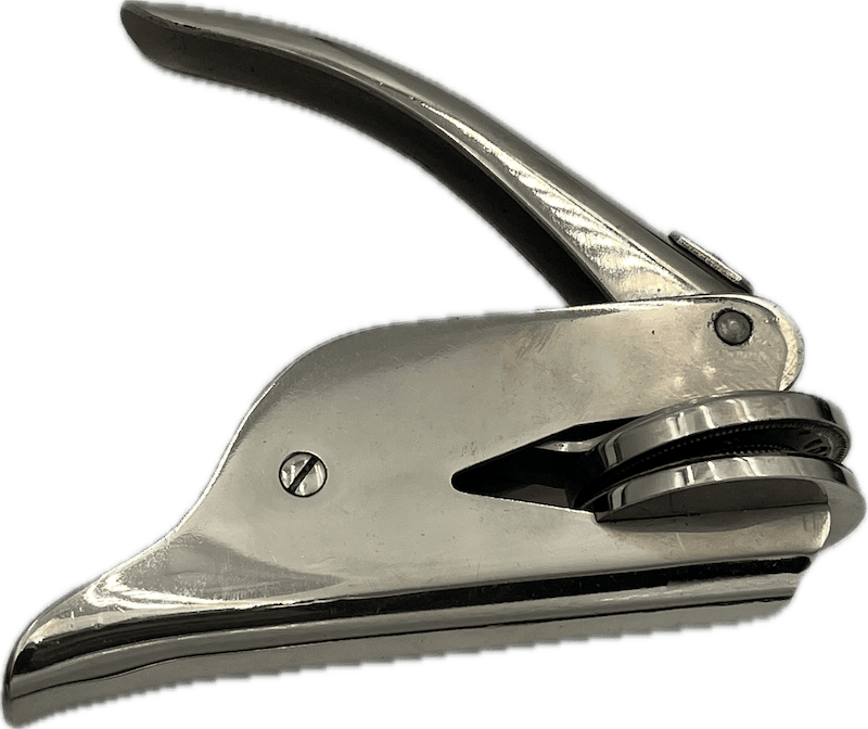 Sturdy vintage chrome desk embosser featuring a curved handle and round die plate. Designed for creating raised imprints on documents, certificates, or office paperwork. Heavyweight all-metal construction with a polished finish and visible screw hardware.