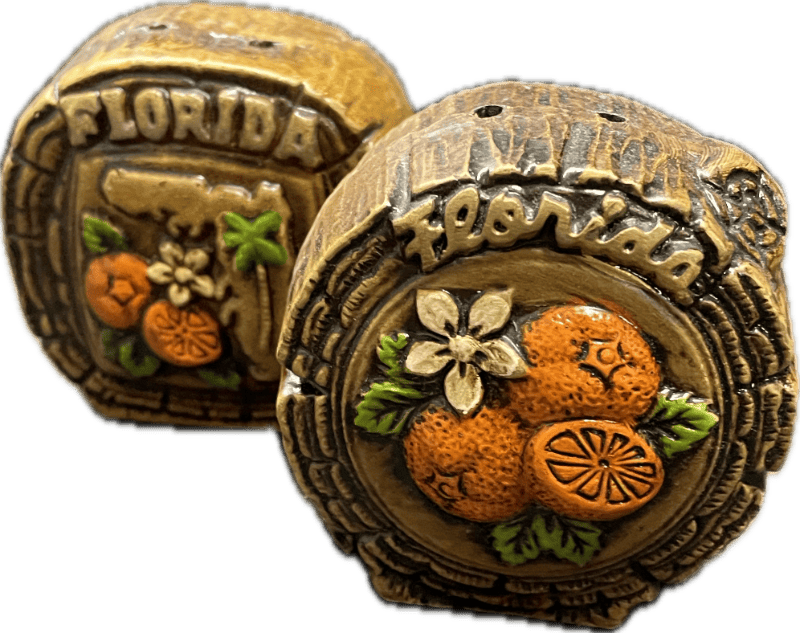 Florida oranges ceramic salt and pepper shaker shaped like round wood stumps from the 1970s.