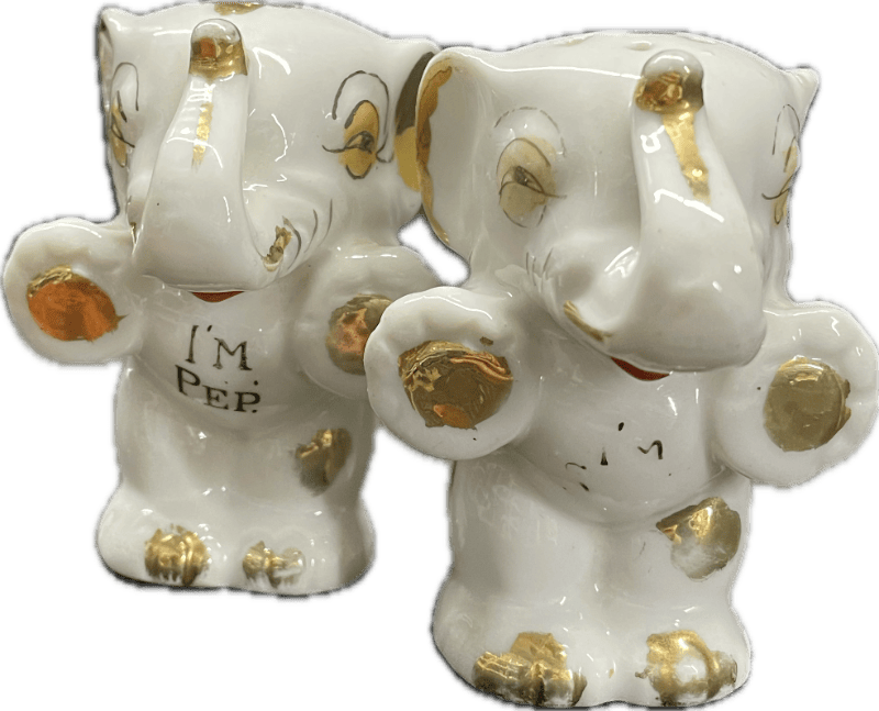 Vintage glazed white and gold ceramic elephant salt and pepper shakers, from the 1940s, Japan.
