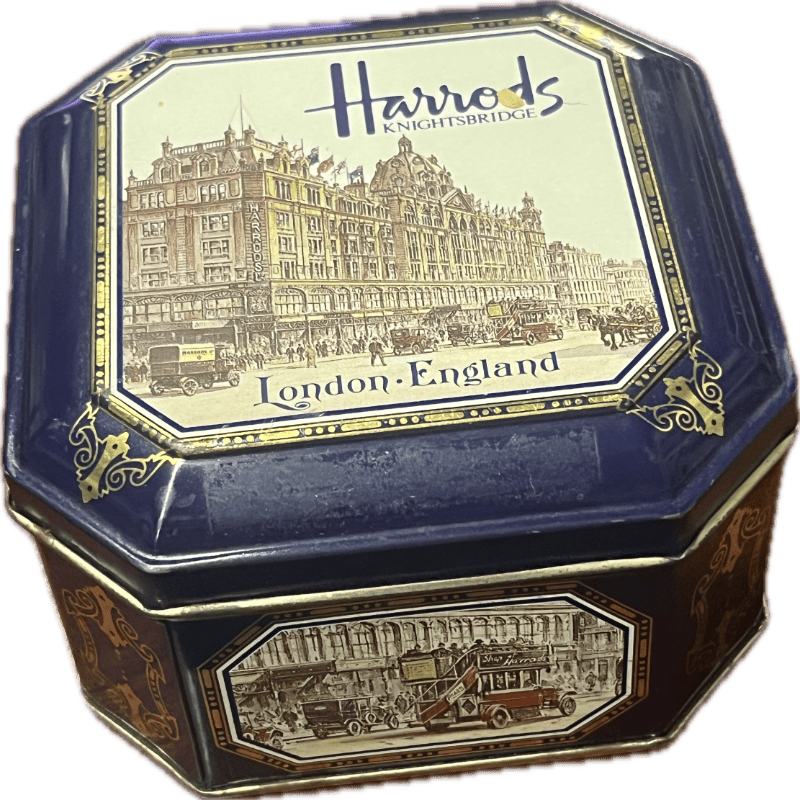 Vintage Harrods of Knightsbridge London England butterscotch sweet tin, made in 2002.